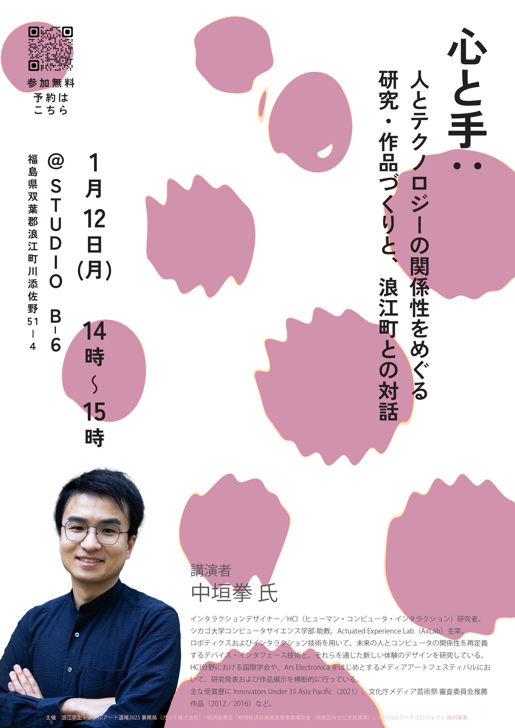 2026年1月12日、浪江学生デジタルアート道場が主催する「地域とアートを知る講義」の第三弾として、中垣 拳氏による講演が浪江町の「STUDIO B-6」にて行われます。