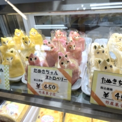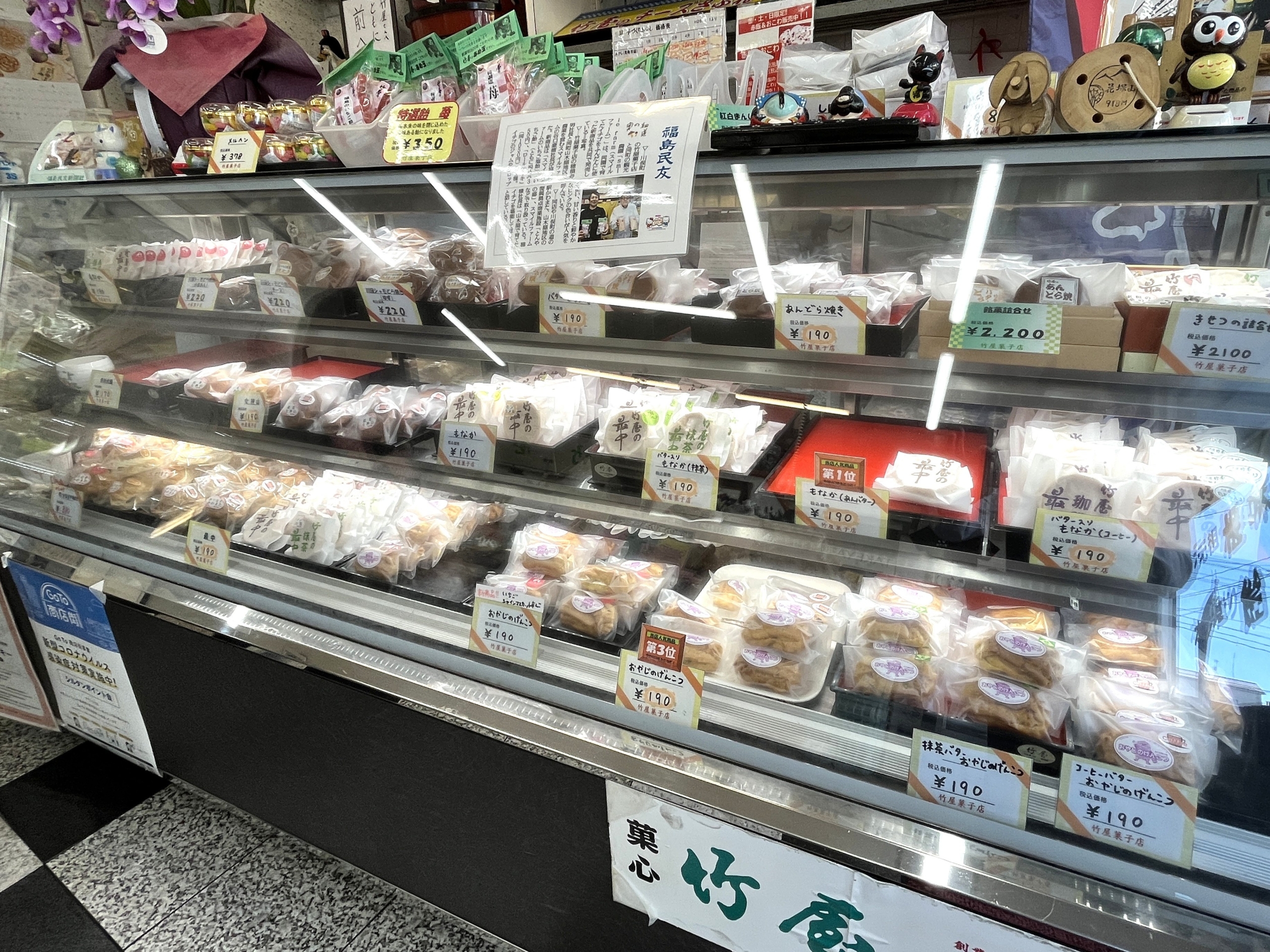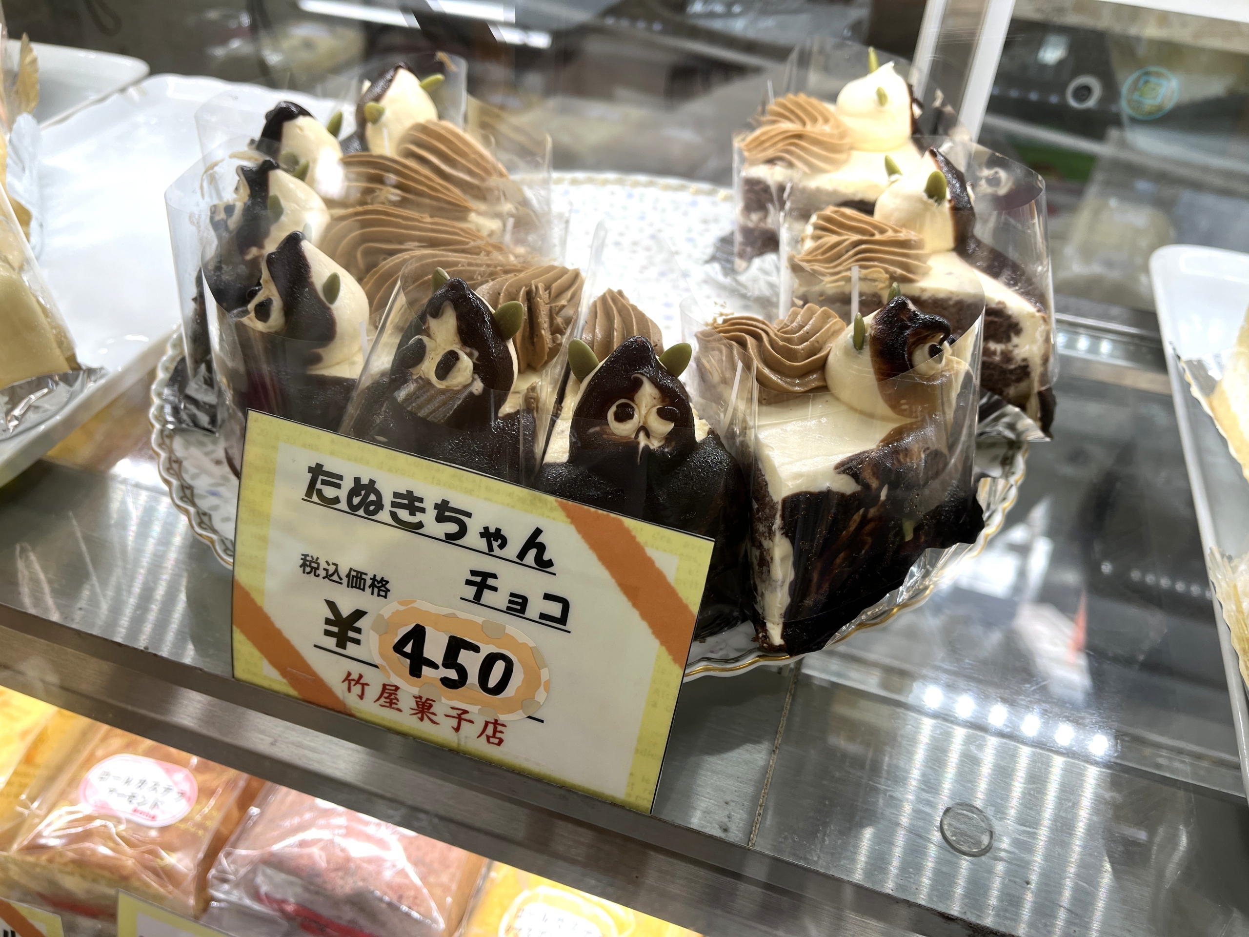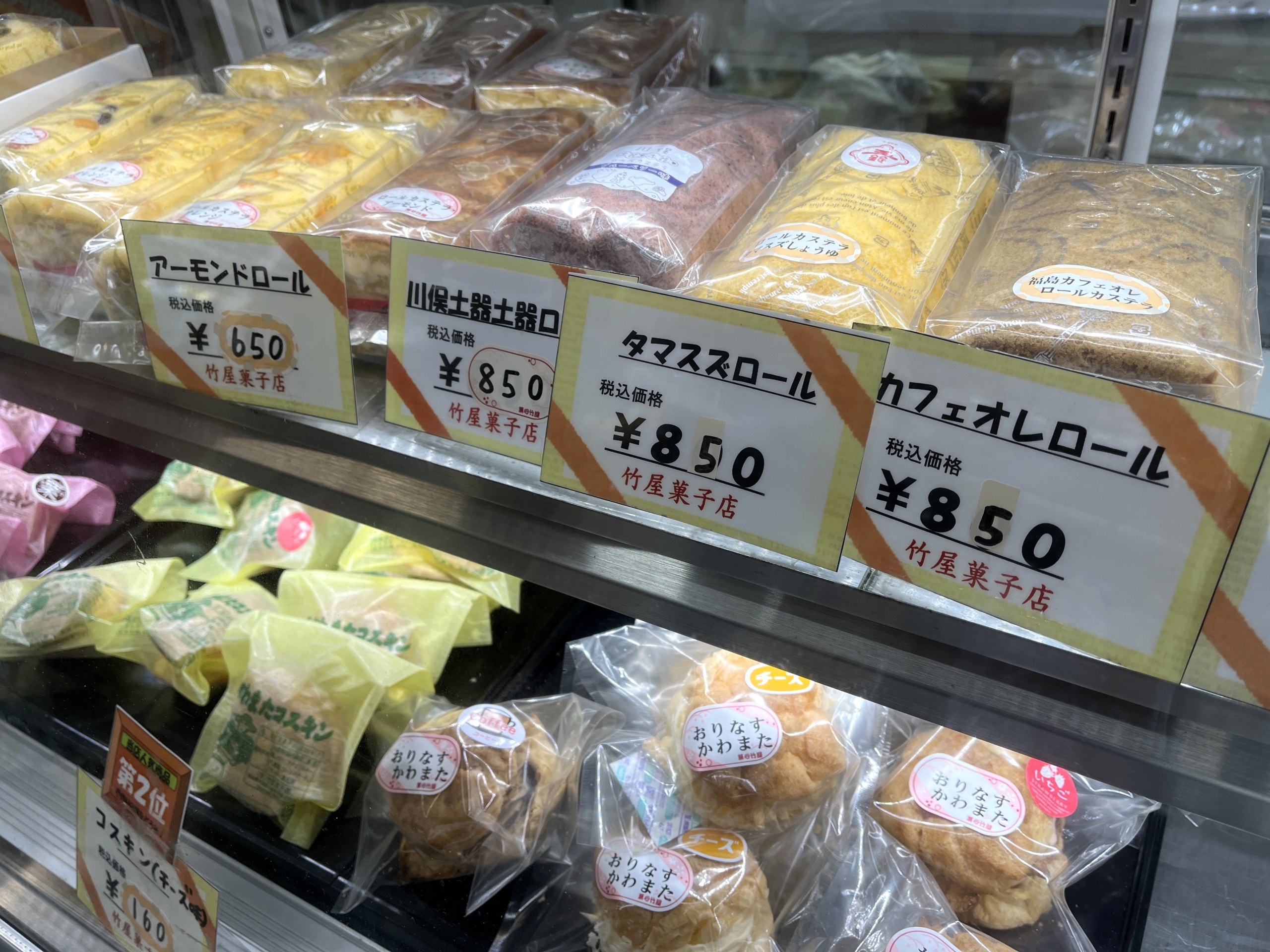 また、竹屋菓子店は飴だけでなく、ロールカステラやケーキ、たぬきケーキなど、和洋問わず多彩な菓子が揃うのも魅力。店内にはぎっしりとお菓子が並び、選ぶ楽しさを味わえます。