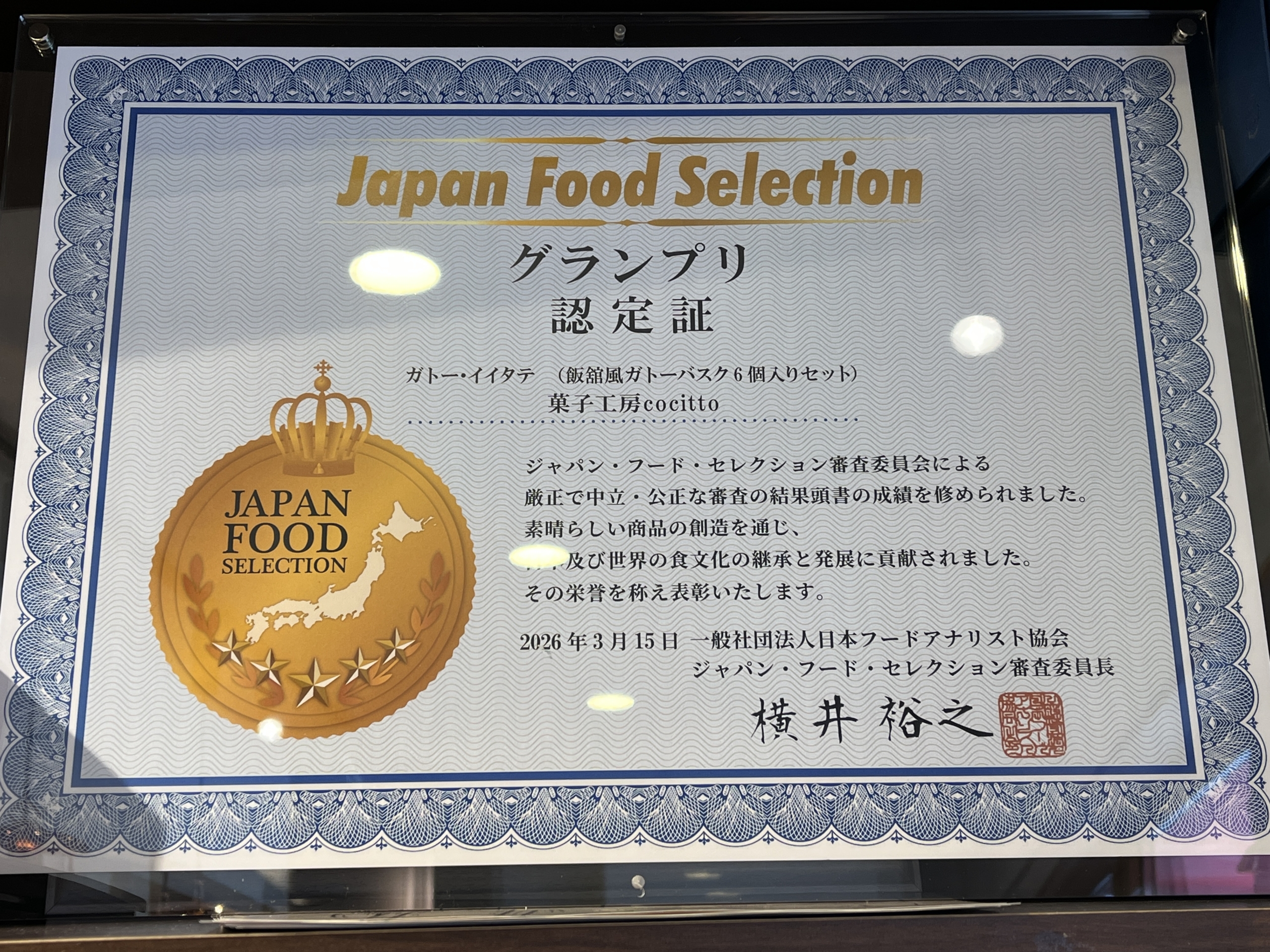 このたびお店の看板商品の一つであるガトー・イイタテが、ジャパンフードセレクション第97回食品・飲料部門グランプリを受賞しました。