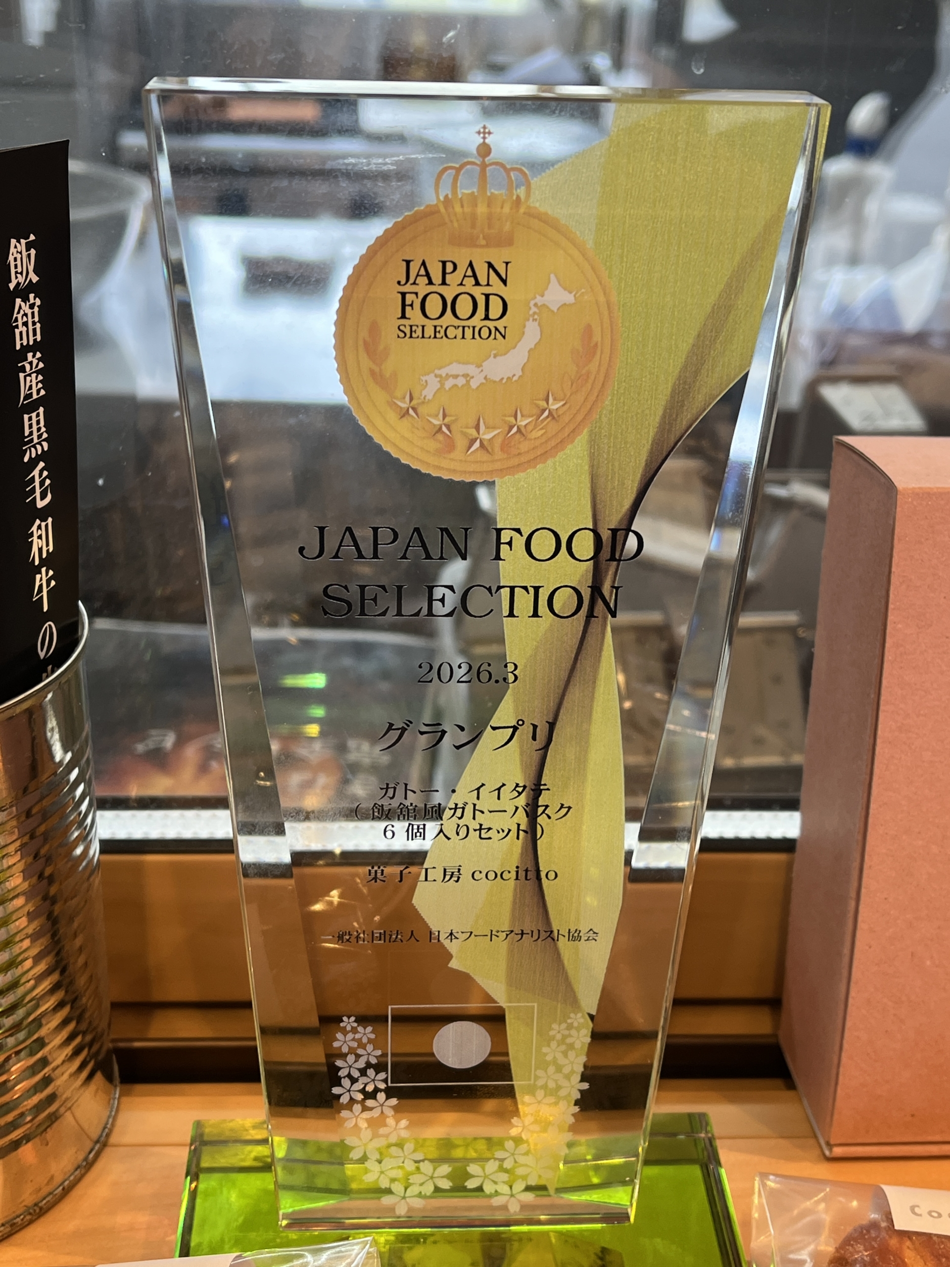 「菓子工房cocitto(コチット)」の「ガトー・イイタテ」がジャパンフードセレクションでグランプリを受賞しました。