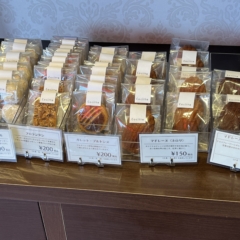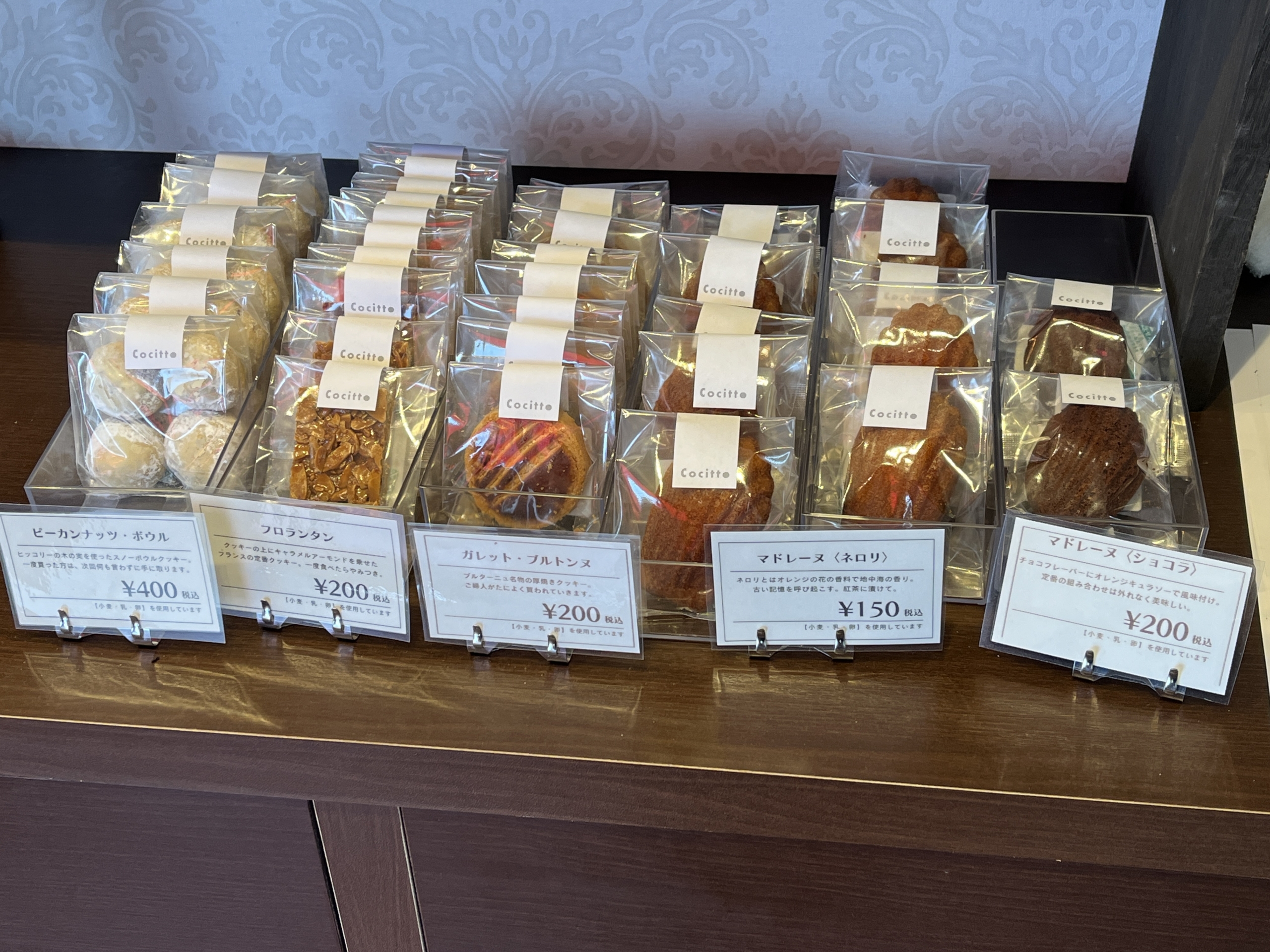 ほかにもカヌレやマドレーヌ等たくさんのお菓子を用意しています。最近はパン焼きにも挑戦中とのこと。こだわりの自家焙煎コーヒーもあります。ご贈答用に詰め合わせも承ります。お近くにお越しの際は、ぜひお買い求めください。