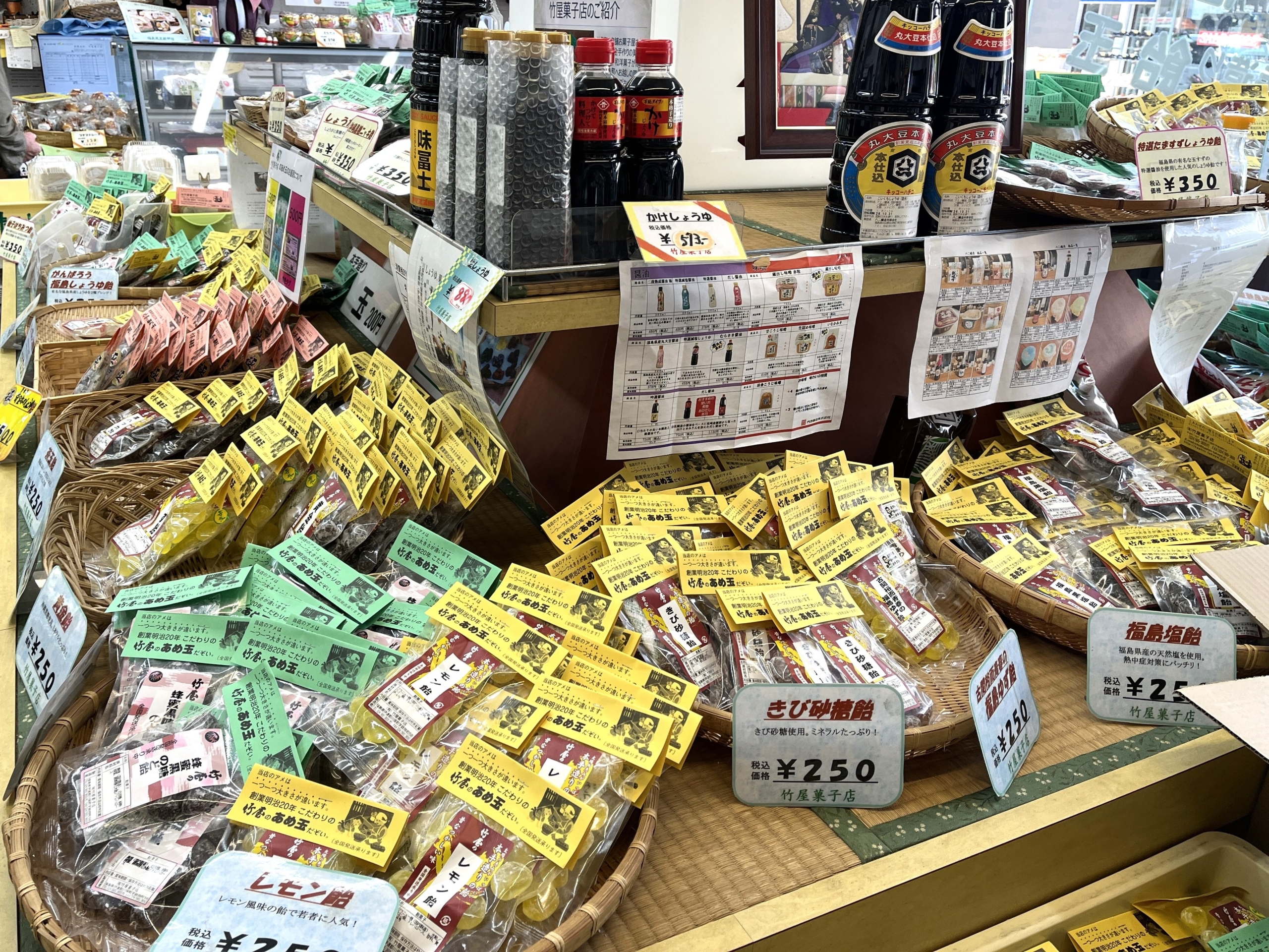 店内に足を踏み入れると、昔ながらの製法でつくられた飴菓子の数々が目に飛び込みます。特に人気なのが、創業時から愛される醤油飴や鉄砲飴(黒飴)。どこか懐かしく優しい味わいが評判で、手土産にもぴったりです。