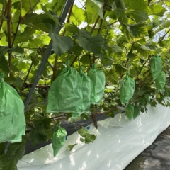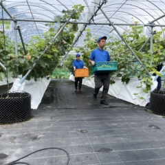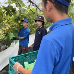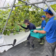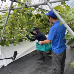 栽培品種はシャインマスカット、ピオーネ、クイーンニーナの3種類で、開所前の昨年3月に、スタッフが約270本の苗木を植え、開所後はサービス利用者も加わり、スタッフの指導を受けながら、木の管理から収穫、梱包までを丁寧に行っています。