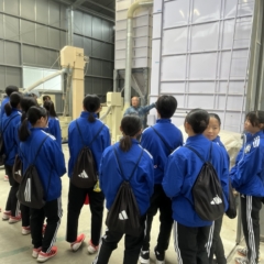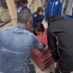 初めて目にする大型の農業機械に、生徒のみなさんはもちろん、引率のコーチのみなさんも興味津々。機械の動きや工程の説明に熱心に耳を傾けていました。