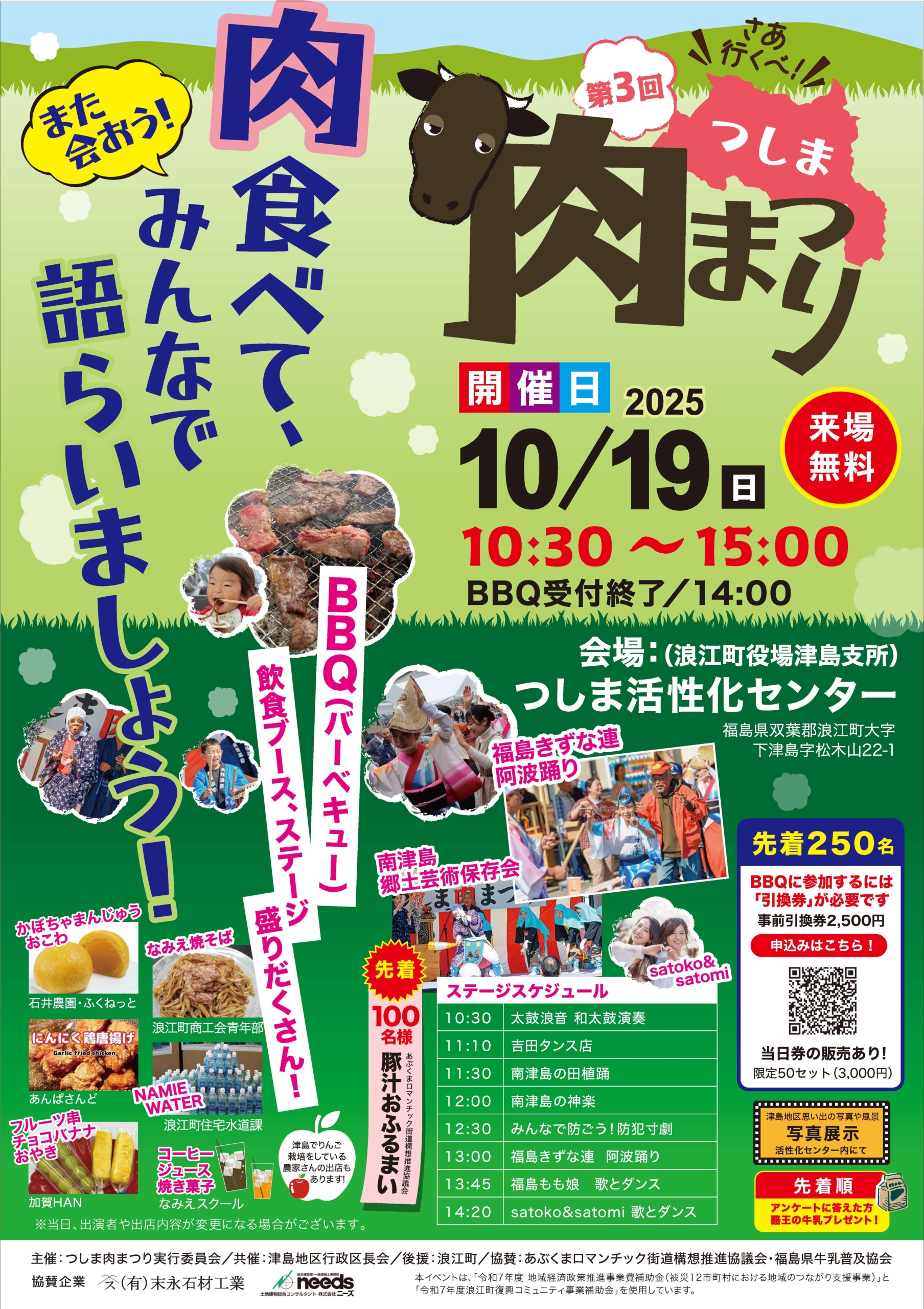2025年10月19日(日)に、つしま活性化センター(浪江町役場津島支所)にて「第3回さあ行くべ!つしま肉まつり」が開催されます。