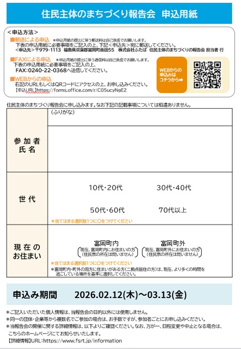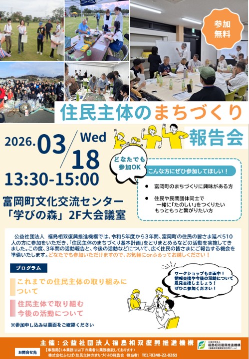 公益財団法人福島相双復興推進機構では、2023年度(令和5年)から3年間、富岡町の住民のみなさま延べ510人の方にご参加いたき、「住民主体のまちづくり基本計画」をとりまとめるなどの活動を実施してきました。この度、3年間の活動報告と今後の活動などについて、広く住民の皆さまにご報告する、「報告会」を開催します。
