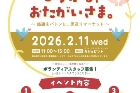 2/11(水)田村市滝根町のカフェ「Gallopinto(ガジョピント)」で「つながる、ひろがる、おたがいさま。~感謝をバトンに。恩送りマーケット~」が開催されます!