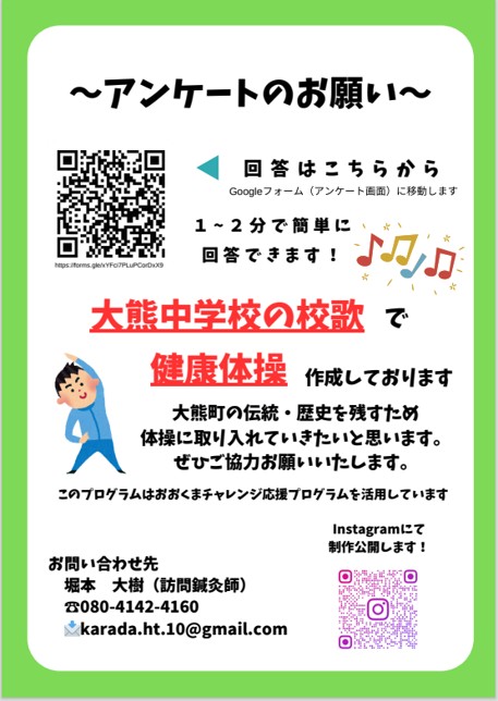 大熊町、双葉町を中心に双葉郡で、鍼灸・整体の出張施術をされている 堀本 大樹さん(大熊町出身)が、旧大熊中学校の校歌を活用する新たな健康体操の制作を進められております。