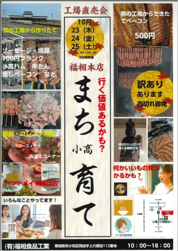 長きにわたり、地元南相馬の皆様に愛されております「福相食品工業」から、日頃の感謝を込めて工場直売会を開催いたします。店舗隣の工場で作られた出来立てのハム、ベーコン、ソーセージの数々は伝統的な江戸末期燻煙製法で時間と手間暇かけて作られた風味豊かな一品です。食欲の秋にふさわしいこの機会にぜひご賞味ください。