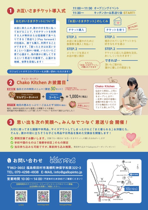 田村市滝根町で昨年12/21(日)にカフェをオープンした「Gallopinto(ガジョピント)」が、2/11(水・祝)NPO法人チームふくしま協力のもと、イベント「つながる、ひろがる、おたがいさま。~感謝をバトンに。恩送りマーケット~」を開催します。