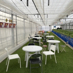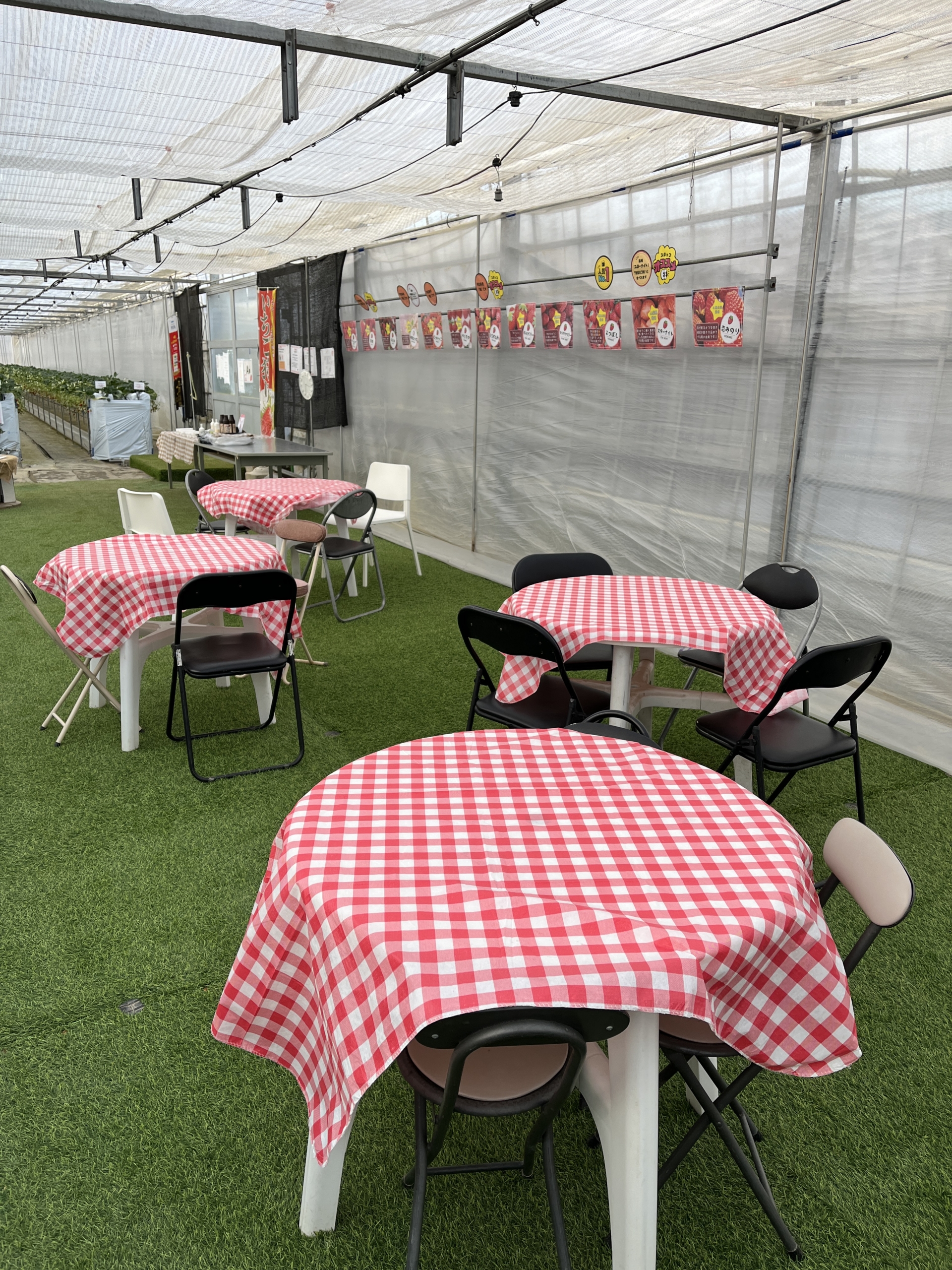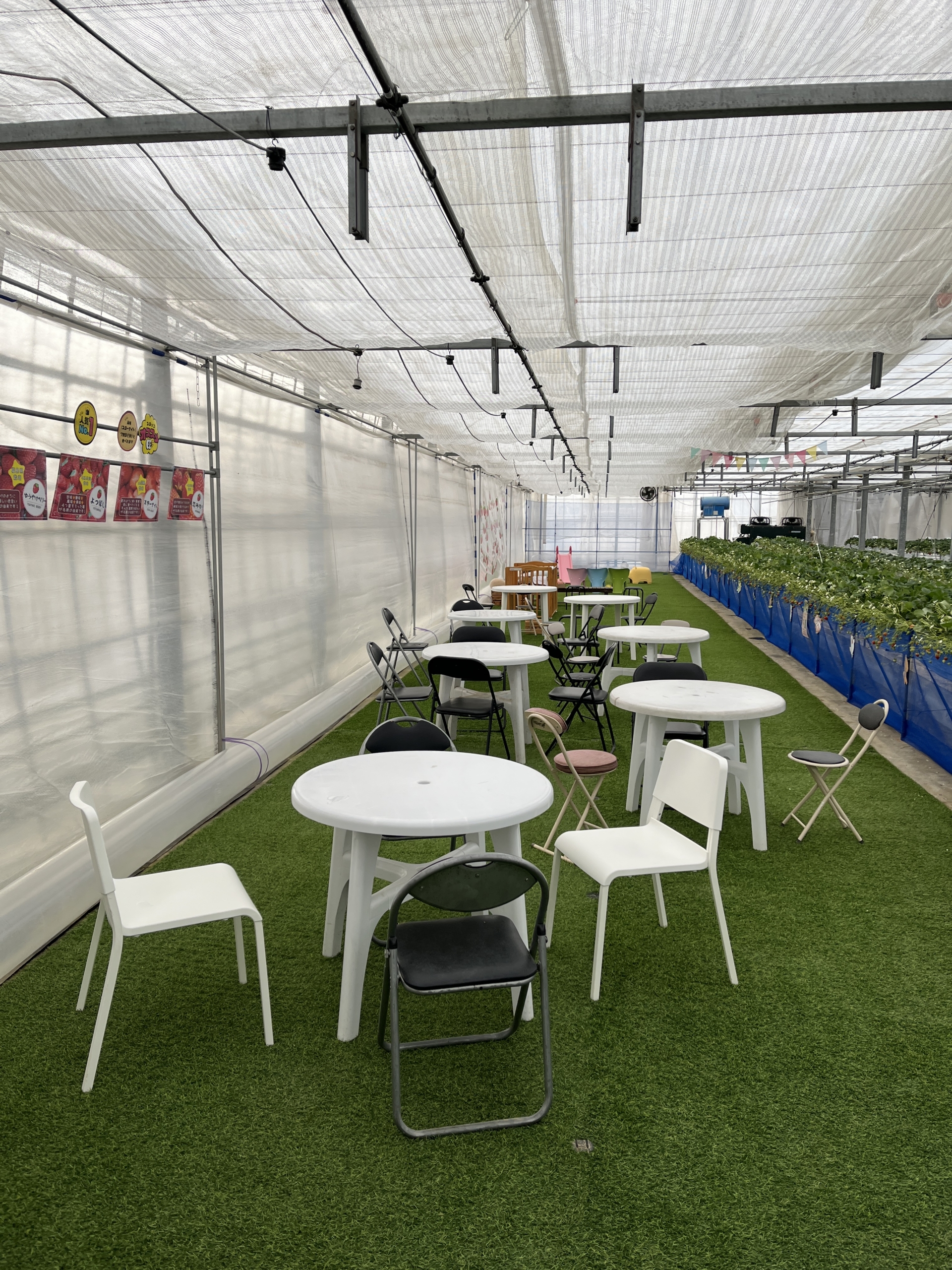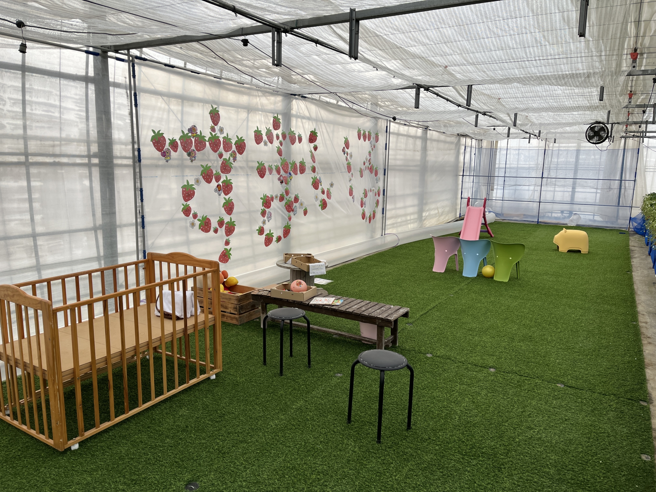 ビニールハウス内にはキッズスペースや休憩スペースが用意されており、キッチンカーで販売しているコーヒーやいちごスイーツを味わうこともできます。