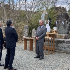 「陶祖祭」は300年以上の歴史を持つと言われる浪江町の伝統的工芸品・大堀相馬焼の陶祖である嘉績翁(かせきおう)を称えるため昭和50年ごろから行われ、震災後の中止を経て、2025年から再び行われています。祭は大堀相馬焼の窯元と浪江町長他約30名の関係者により厳粛な雰囲気の中執り行われ、主催者である大堀相馬焼協同組合の半谷秀辰(はんがい ひでとき)理事長は「先人もこの日を喜んでいると思う。偉業を絶やすことなく、400年、その先まで続けていきたい」とお話しされていました。