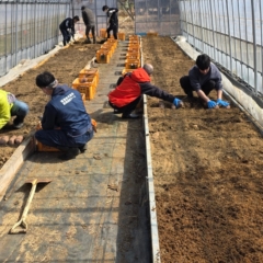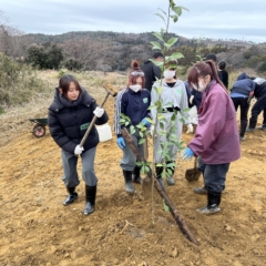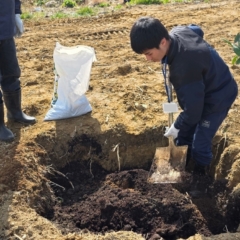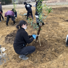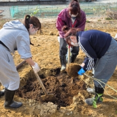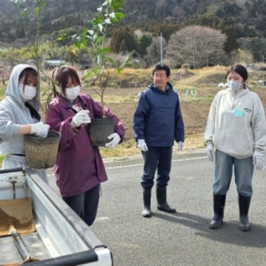 根鉢をほぐし、土壌を整え、しっかりと固定。楢葉の特産品を次世代へつなぐ一歩です。
