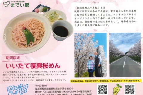 いいたて村の道の駅までい館では3/1(日)~4/30(木)期間限定で「いいたて復興桜めん」和菓子付を提供しております。