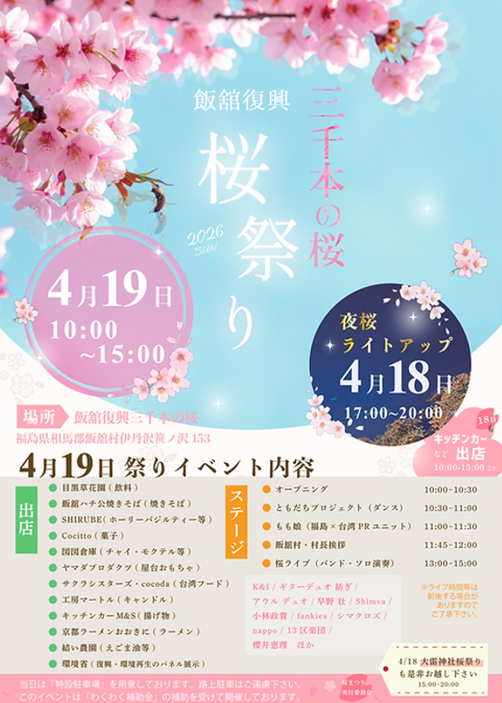さくら祭りの開催は4月19日(日)を予定しており、18日(土)の17時から20時にはライトアップも予定されていますので、ぜひお近くにお越しの際はご覧ください。