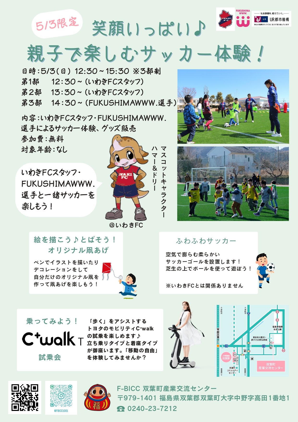 だるま絵付け体験(全日)や、5月3日には当日限定でいわきFCスタッフやFUKUSHIMAWWW.選手によるサッカー体験(参加無料)およびグッズ販売など、親子で楽しめるコーナーもございます。