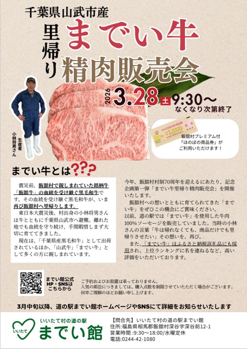 - いいたて村の道の駅までい館「飯舘産黒毛和牛精肉販売会」開催!